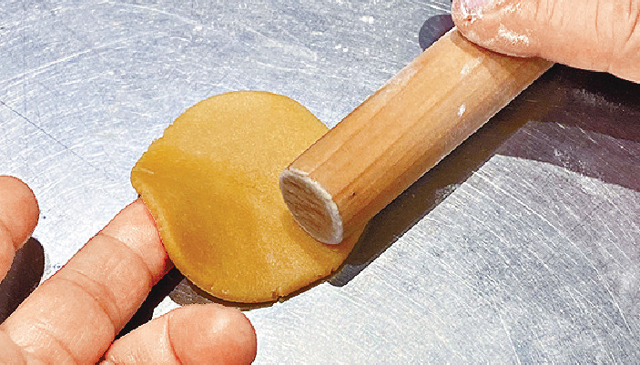 5. 把饼皮压匀成圆形。