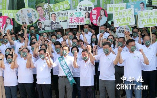 郑运鹏上午日在桃园市长郑文灿、竞总总干事黄世杰、政策平台召集人林飞帆以及32名党籍市议员参选人陪同下,赴桃园市选委会登记参选桃园市长。