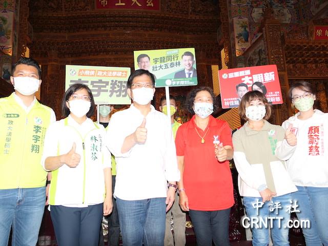 林佳龙今日上午参拜新北市五股区“贺圣宫”,陪同者有民进党“立委”林淑芬、民进党新北市议员赖秋媚,以及民进党新北市议员参选人李宇翔、颜蔚慈。“贺圣宫”宫主、丽宝集团董娘王美云也到场陪同参拜。