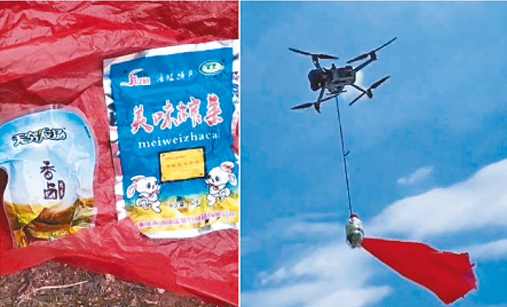 台湾军方前日透露,有大陆民用无人机当日闯金门,并投放一垃圾袋,内有榨菜及茶叶蛋。内地网友“泉州机长”当晚在互联网公开视频,证实自己向金门台军投放“榨蛋”包裹。他还附上一封信,自嘲大陆生活条件差、吃不起茶叶蛋跟榨菜,所以特别送上大礼,“慰问前 守军”。