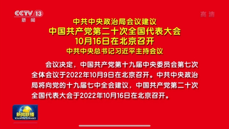 会议强调,中国共产党第二十次全国代表大会,是在全党全国各族人民迈上全面建设社会主义现代化国家新征程、向第二个百年奋斗目标进军的关键时刻召开的一次十分重要的大会。大会将高举中国特色社会主义伟大旗帜,坚持马克思列宁主义、毛泽东思想、邓小平理论、“三个代表”重要思想、科学发展观,全面贯彻习近平新时代中国特色社会主义思想,认真总结过去5年工作,全面总结新时代以来以习近平同志为核心的党中央团结带领全党全国各族人民坚持和发展中国特色社会主义取得的重大成就和宝贵经验,深入分析国际国内形势,全面把握新时代新征程党和国家事业发展新要求、人民群众新期待,制定行动纲领和大政方针。