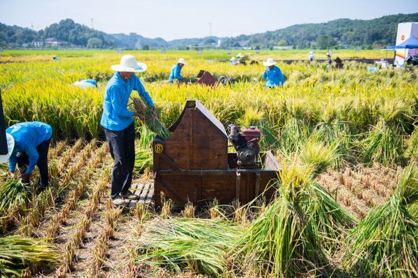 2021年9月23日,湖南长沙举行了中国农民丰收节主场活动。图为9月23日,在长沙县路口镇明月村隆平稻作公园,农民在进行水稻收割赛。(新华社发)