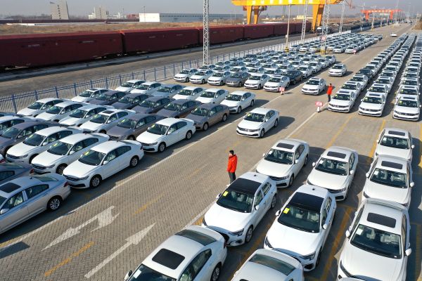 在青岛即墨国际陆港济铁物流园,一汽大众汽车准备通过商品车铁路运输专线发往全国各地。(新华社发)