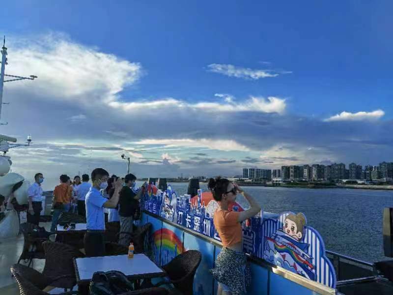 首航当天,夕阳西下、海风轻拂,2-3分钟就有一架飞机从空中掠过。嘉宾和游客尽情饱览空海“联动”的特别景致和沿途风光,纷纷拿出手机拍照记录。除了航线沿途无限风光之外,船上还有充满文艺气息的节目表演、妙趣横生的互动游戏,给游客带来了丰富多样的休闲体验,为深圳及周边城市居民周末家庭休闲提供了新选择。