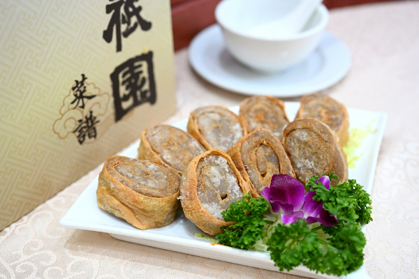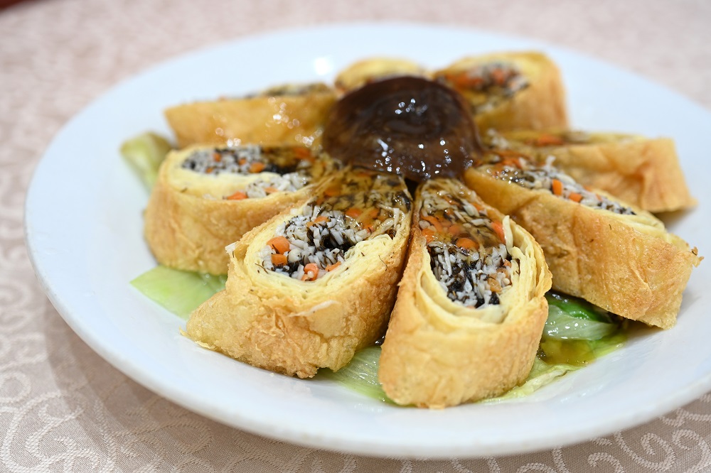 翡翠法轮卷,腐皮卷上发菜、金菇及甘笋等,简简调味,原留食材原味道。