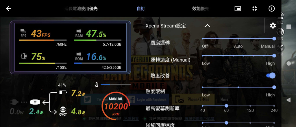 无论外形或功能,Xperia 1 IV Gaming Edition都跟普通版别无二致,除了机身只有黑色,以及RAM容量由12GB增至16GB,至于能让玩家更容易在游戏中取胜的地方,是套装附有新开发的Xperia Stream专用配件,既是散热风扇,亦是扩充背盖。使用时直接把Xperia Stream套在手机上即可,接着游戏增强器会弹出控制页面,既可查看实时FPS画面帧率、存储器使用状况等系统信息,也可以在这里调校风扇运行模式、运转速度、升压模式及热度限制等功能,由于风扇最高转速达10,200rpm,加上Xperia Stream设有多个入风及出风口,试用时发现确实可以产生强劲气流,将打机时机身热力持续带走,令手机系统保持稳定,不会因过热而降速,官方指实时以高画质及高FPS玩游戏,玩了一段时间仍可保持画面帧率稳定,不会出现大幅下降。由于这次厂方找来专业电竞团队合作设计,即使Xperia Stream看起来机身有点厚,但重量其实仅142g,而且流线外形令拿上手后,手感仍然舒适,甚至有点像握着手提游戏机。