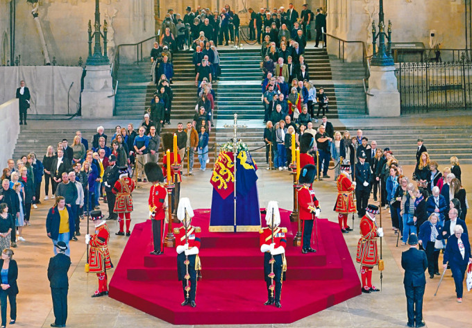 英女王伊丽莎白二世灵柩周三下午由伦敦白金汉宫移灵抵达西敏厅,公众于当日下午五时开始进入厅中瞻仰。在当地时间昨日下午,排队人龙绵延达七公里,许多人须等九个钟头。有悼念者说:“内里真的很肃静,不少人流下眼泪。”司礼大臣昨日宣布,下周一国葬的主旨是“团结全世界人民”。