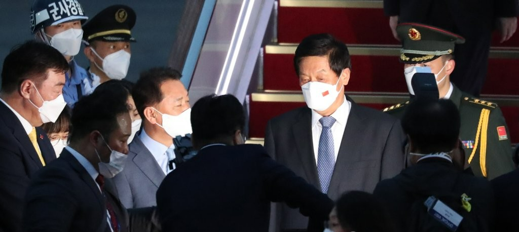 9月15日,在位于韩国京畿道的首尔机场,中国全国人大常委会委员长栗战书(右二)接受韩方人员迎接。 韩联社/国会摄影记者团