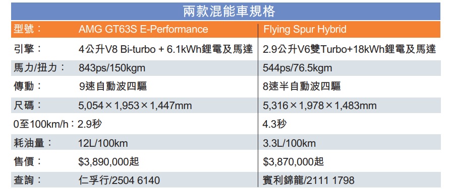 电动车潮流一触即发,传统汽油车如果没有独特新话题,很难突围而出。最近适逢两款极级PHEV汽油混能车同步抵港开售,首先是马力843ps、0至100km/h加速2.9秒的平治AMG GT63S E-Performance,为史上最强四门超跑;另一款是走顶尖奢华路线的宾利Flying Spur Hybrid。两者售价几乎相同,而风味及享受则各有千秋。