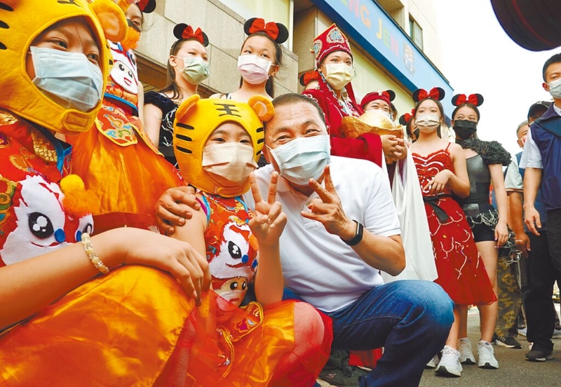 新北市长侯友宜17日出席“大中和土地公文化祭”活动,并与参加踩街表演的小朋友及团体合影留念。(中时电子报)