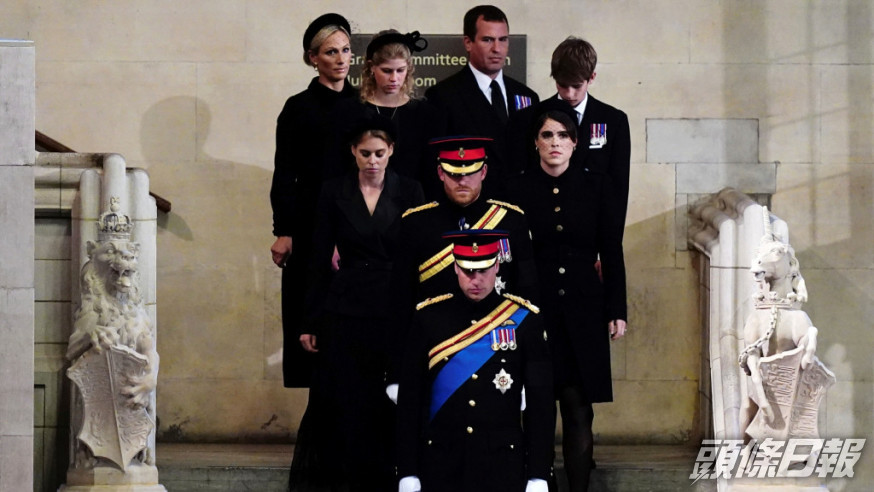英女皇伊利沙伯二世的灵柩继续停放在国会大楼的西敏厅,让公众瞻仰。继英皇查尔斯三世联同3名弟妹,前往西敏厅出席守灵仪式后,英女皇全部8名孙儿及外孙,星期六亦去到西敏厅守灵,其中威廉及哈里两兄弟穿上军服,向祖母英女皇致敬。
