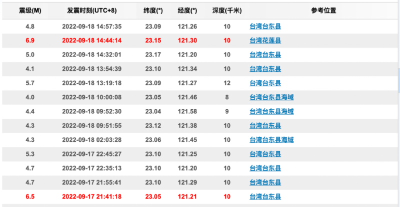 据中国地震台网测定,17日、18日两天,台湾台东县、花莲县等地已发生多场地震。