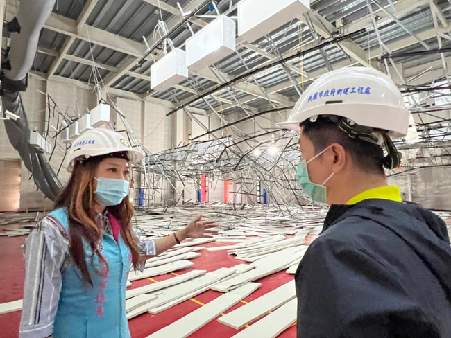 八德国民运动中心羽球馆天花板被震垮,八德选区国民党市议员朱珍瑶到现场瞭解。(照片:朱珍瑶提供)