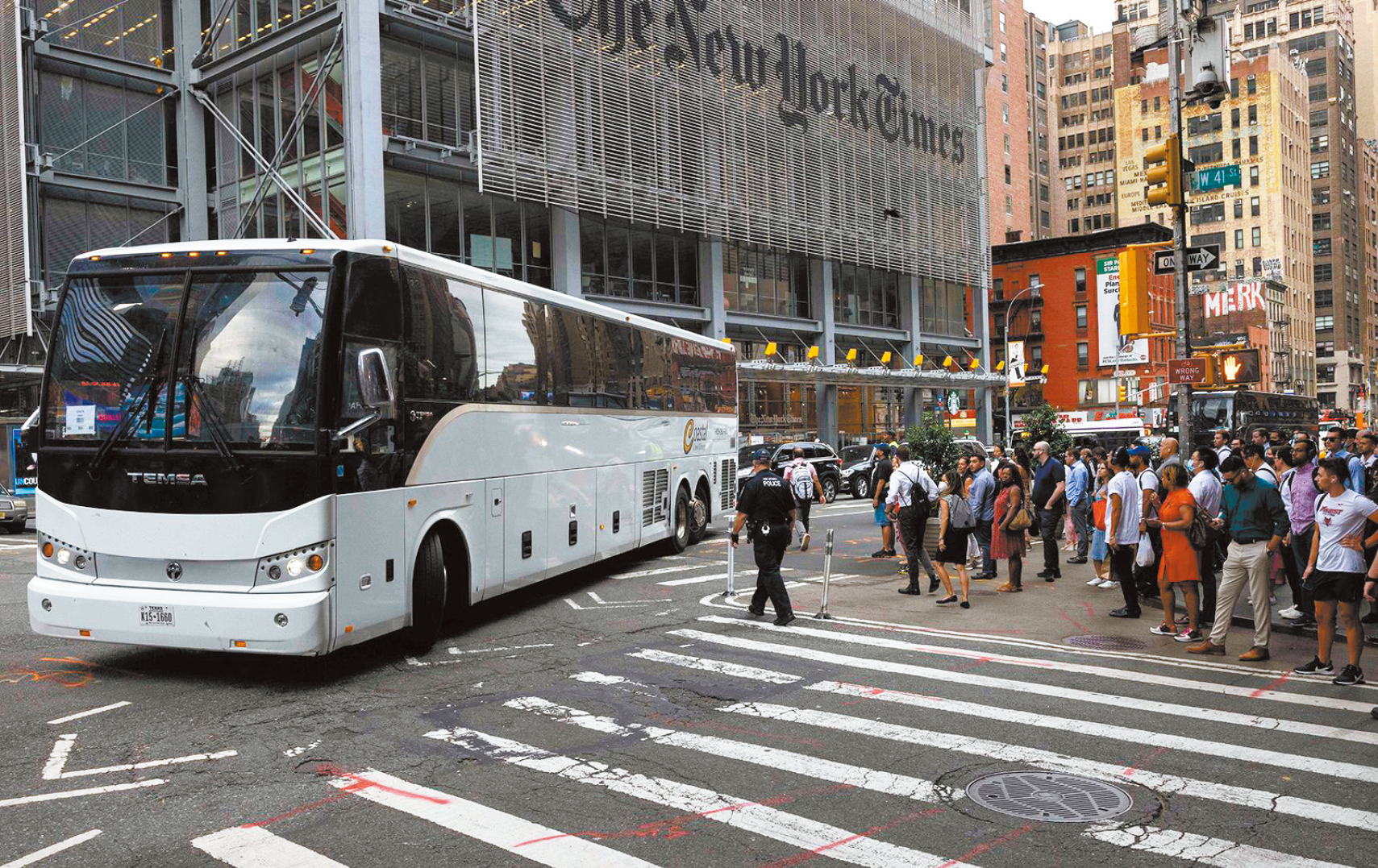 至少6辆来自得州的巴士载满无证客,于18日早上抵达纽约,日前也有载满移民的巴士前往首都华盛顿,直接停在副总统贺锦丽的官邸门外。自今年5月起,共有超过1.1万名无证移民入住纽约市的游民收容所,其中2500人由得州州府包车送到纽约。除了得州之外,佛州州长德桑蒂斯(Ron DeSantis)也在上周,将数十名无恒移民用飞机送到麻省夫人聚居的马莎葡萄园岛(Martha's Vineyard)。
