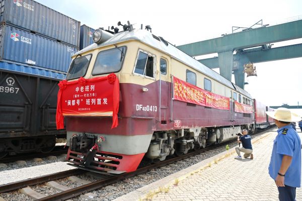 8月31日,福建首趟中老铁路国际货运列车从福州江阴港站开出。(新华社)