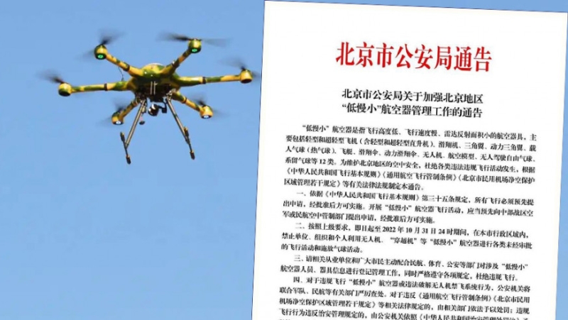 北京公安局:下月底之前禁飞无人机及放气球。