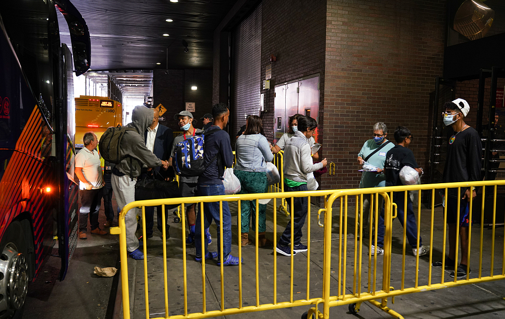 9月4日,美国纽约,一辆载有移民的大巴抵达纽约市。(资料图)