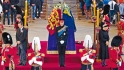 女皇灵柩周一在西敏寺举行国葬仪式,英皇查尔斯三世、皇储威廉、哈里王子等皇室成员,及众多宾客站立迎灵柩。