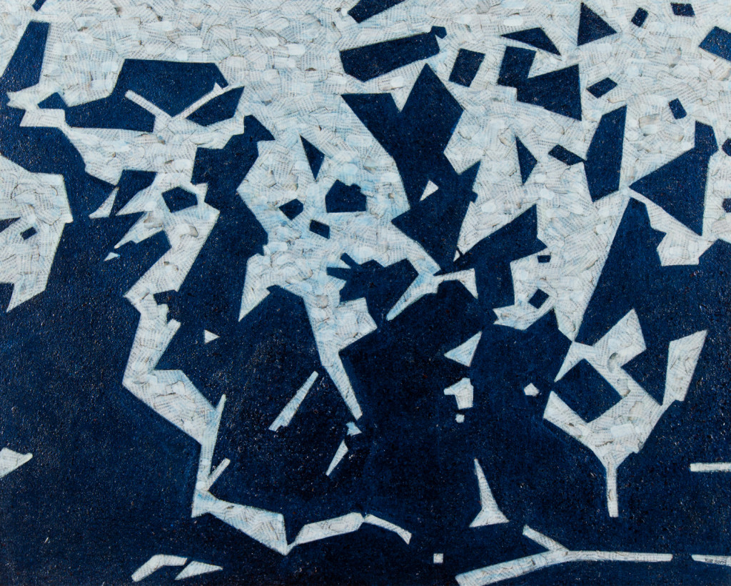 《非常道–薛松近作展》展出的二十多幅作品,属于薛松自2019年开始的《法自然》系列。“法自然”出自《道德经》中“道法自然”的哲学思想,意指宇宙天地间万物运行均遵循的“道”,亦即世界的本源,规律的本身。道之本性是自然而然,周而复始,往复循环。《法自然》系列以自然、四季、节气等现象为题,通过拼贴、解构与重组,呈现如水、火、叶脉、大理石、冰裂等自然景物,构成一种大自然间生命轮回的意像。若细看,会发现用作拼贴的现成图像文本,与内容形成了一种有趣的冲突,作品给人返璞归真的感觉,艺术家明显地更为注重情感与哲理的表达。
