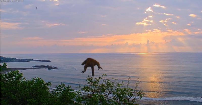 台东强震震撼全台,花东天摇地动尤其恐怖,东部海岸国家风景区管理处设置的即时影像意外拍到地震时“天外飞来一只猴子”,猴子被地震吓到跳树迫降逃窜。
