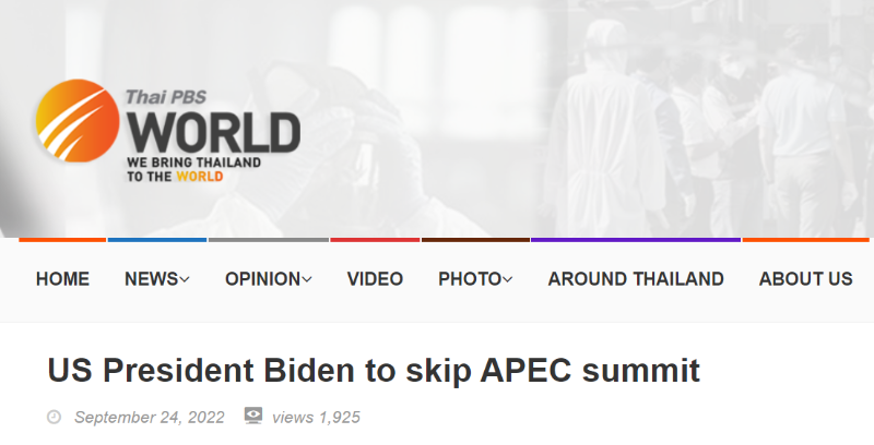 据泰国公共广播服务公司(Thai PBS)下属“Thai PBS World”新闻网24日报道,2022年亚太经合组织领导人非正式会议将于11月18日至19日在泰国曼谷举行,由于“家庭事务”,美国总统拜登将不出席此次会议。