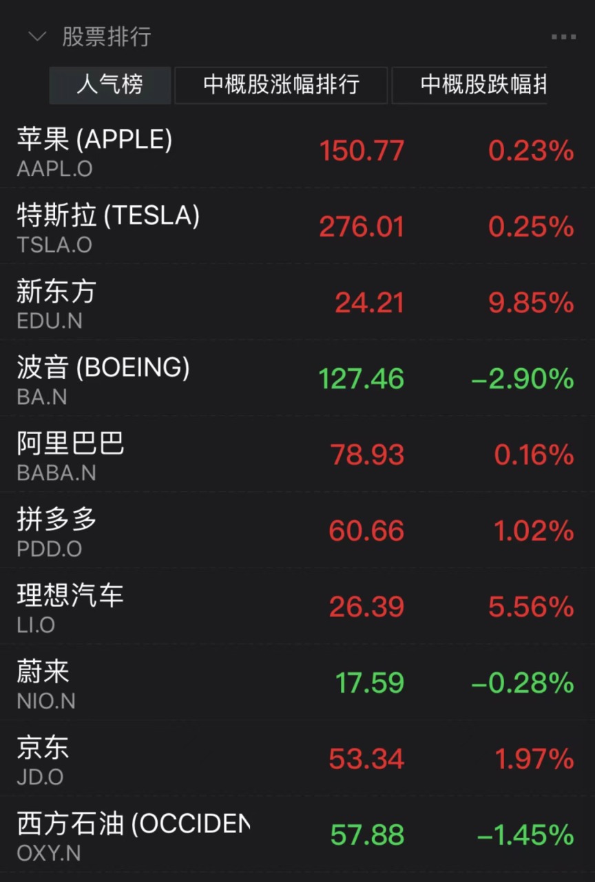 热门中概股多数上涨,新东方上涨9.85%,京东上涨1.97%,阿里巴巴上涨0.16%,拼多多上涨1.02%,理想汽车上涨5.56%,小鹏汽车上涨4.74%,蔚来汽车下跌0.28%。