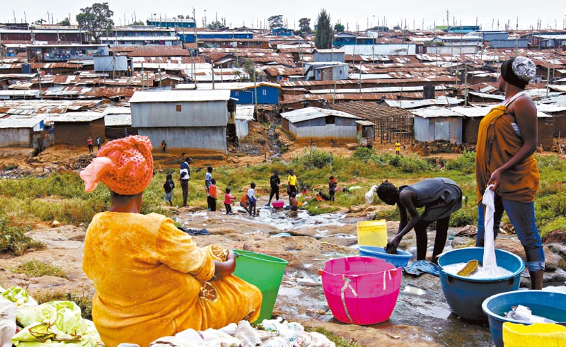 ▲肯尼亚极度缺水,图为当地贫民窟居民为省水聚在一起洗衣。路透社