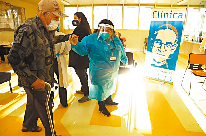 ▲一名医疗助理在洛杉矶帮助一名等待接种新冠肺炎疫苗的老人。
