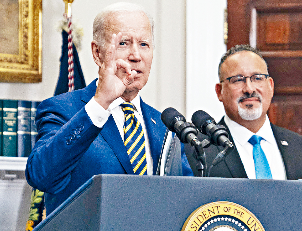 ▲保守派法律团体太平洋法律基金会,入禀印第安纳州联邦法院,起诉教育部和部长卡多纳(右),称拜登政府的学贷减免计划违宪,要求当局取消。