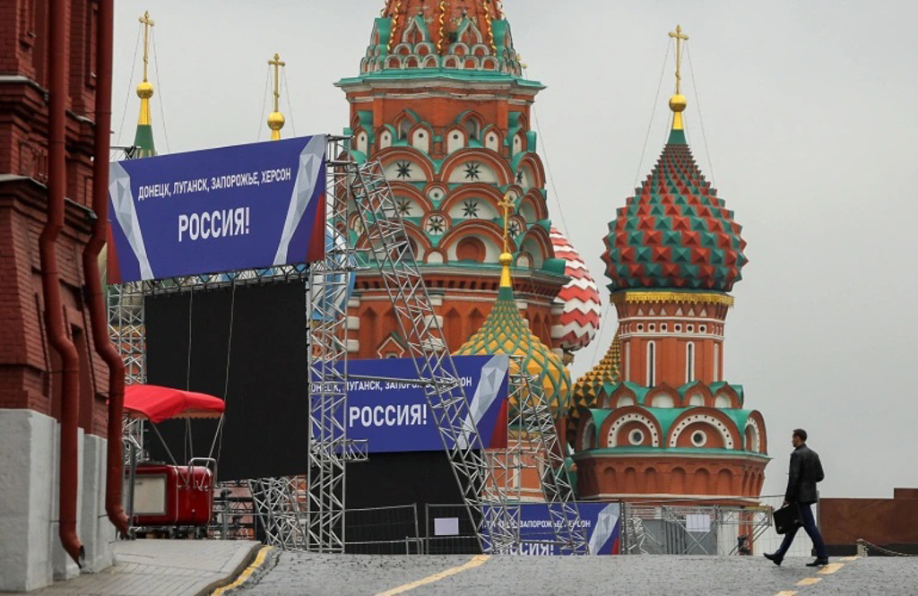 ▲克里姆林宫的红场,正在布置“欢迎顿内次克、卢甘斯克、扎波罗热、刻松加入俄罗斯”。