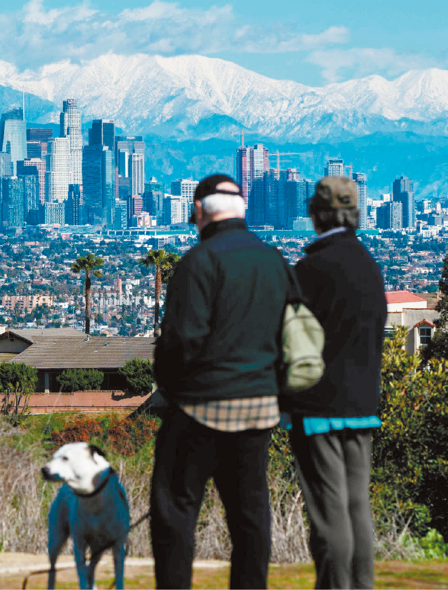▲洛杉矶的繁华离不开北水南调工程的助力。图为一对夫妻俯看洛杉矶市中心。美联社资料图片