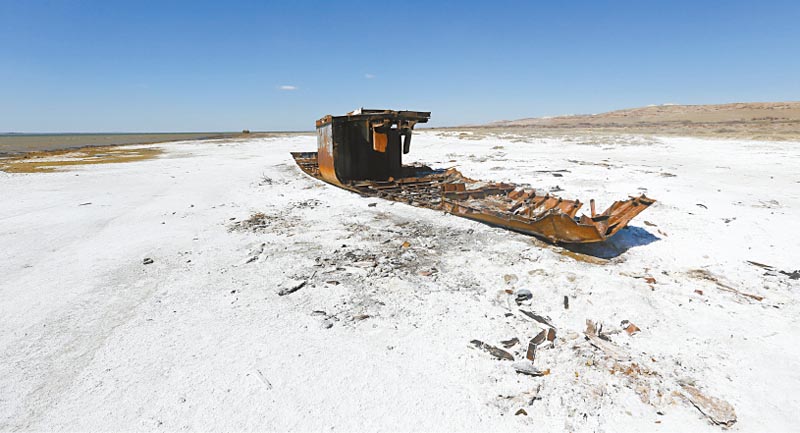 ▲如今的咸海几乎干涸,图为轮船搁浅在海中。路透社资料图片