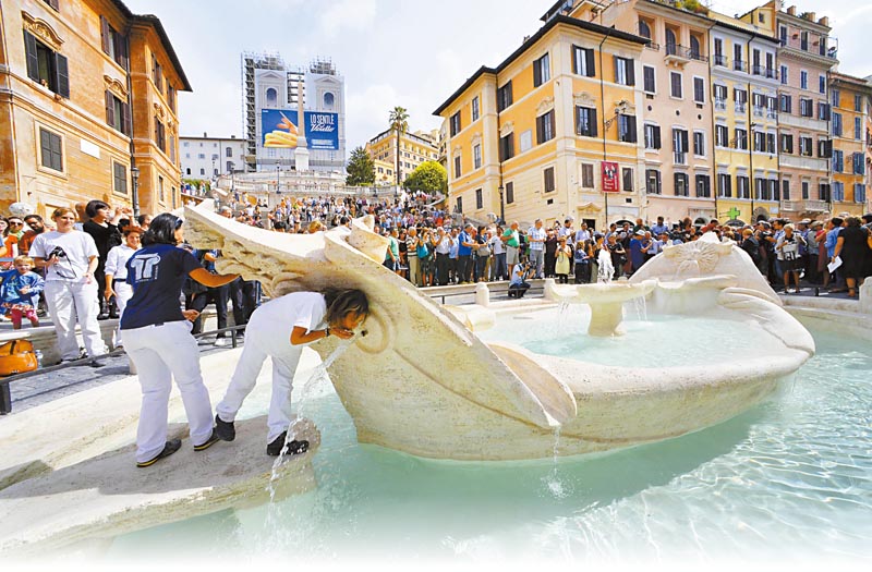 ▲欧盟各国多管齐下治理水资源,让人们可以享用充足且优质的饮用水。图为意大利罗马广场,人们饮用喷泉水。资料图片