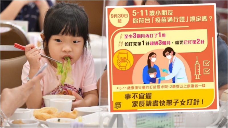 香港的“疫苗通行证”适用年龄由今日(30日)起降至5岁。5至11岁儿童进入任何“疫苗通行证”适用处所,包括食肆堂食,均须符合“疫苗通行证”下订明的接种要求,即接种两剂新冠疫苗,或接种第一剂新冠疫苗后未满3个月。到11月30日起,5至11岁儿童的“疫苗通行证”接种要求会统一为须已接种第2剂疫苗。