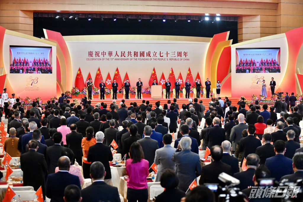 国庆酒会今早于会展举行,行政长官李家超致辞时表示,今年是特区回归25周年,香港过去经历挑战和考验,但总能遇强愈强,皆因祖国是香港的坚强后盾,并指其首份施政报告筹备工作进入最后阶段,强调与团队不忘初心,牢记使命,为香港谋发展。