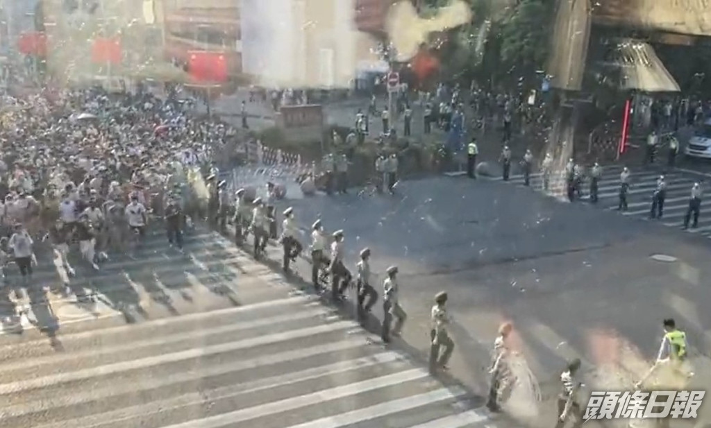▲上海南京路步行街武警再次组成“人墙”保护游人过马路。网图