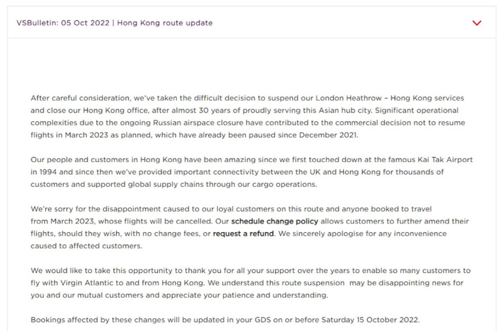 维珍航空今日(5日)在官方网站发布消息,无限期停飞来往伦敦至香港航班,并会关闭香港办公室,据官网解释,停飞原因是俄罗斯空域持续关闭,原计划2023年3月恢复直航机赴港,现时决定不按原计划执行,无限期暂停安排直航机赴港,并关闭位于香港的办公室。