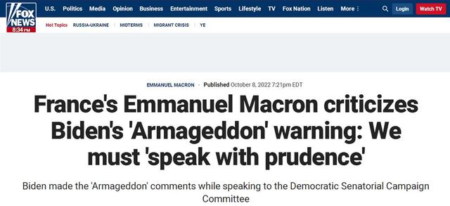 福克斯称,马克龙是在批评拜登此前的言论。美国总统拜登6日警告,发生“核末日”的风险处于“自1962年古巴导弹危机以来的最高水平”。“自肯尼迪时代和古巴导弹危机以来,我们还没有面临过‘核末日’的前景。普京在谈论可能使用战术核武器时不是在开玩笑,因为他的军队表现不佳。”拜登在一次筹款活动上谈到乌克兰危机时称,使用战术核武器会很快导致局势失控,令世界陷入毁灭。