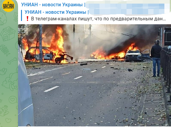 乌克兰独立新闻社报道称,基辅发生爆炸后,有汽车受损。报道还一并配上了汽车受损的画面。