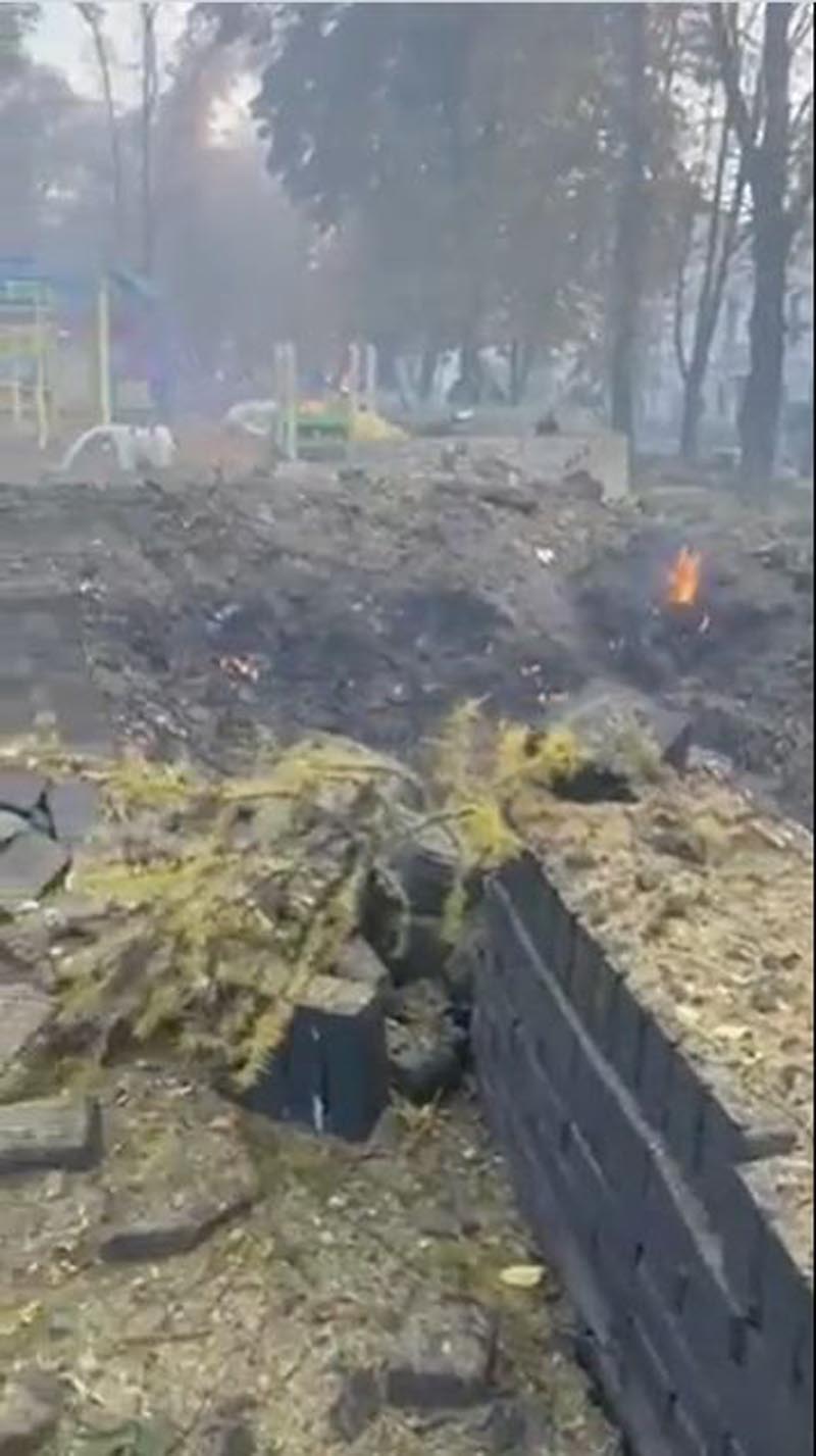 此外,基辅市中心一个儿童游乐场被炸出巨坑的影像也在网上流传。据《华尔街日报》报道,事发地点为舍夫琴科公园(Shevchenko Park),画面显示现场炸出一个巨坑,坑内还有火在燃烧,背景是一些儿童的游乐设施。