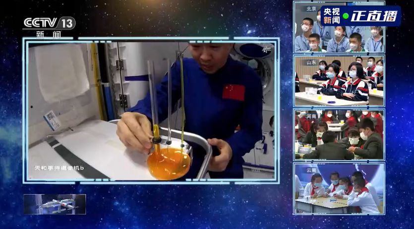 在“天宫课堂”第三课,中国航天员邀请青少年同步天地做实验,采取天地互动方式进行,3名航天员在轨介绍展示中国太空站“问天实验舱”工作生活场景,演示微重力环境下毛细效应实验、水球变“懒”实验、太空趣味饮水、会调头的扳手以及植物生长研究项目介绍,并与地面课堂进行互动交流,旨在传播普及载人航天知识,激发广大青少年对科学的兴趣。