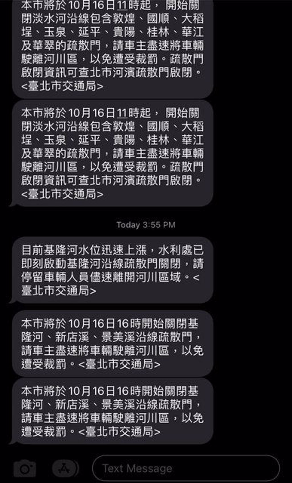 但有网友表示,北市府昨日上午7时54分就发布简讯通知,河滨疏散门上午8时启动只出不进;北市交通局下午4时也有发简讯提醒,基隆河水位迅速上涨,水利处即刻启动基隆河沿线疏散门关闭,请停留车辆人员尽速离开河川区域。
