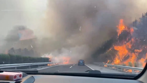 ▲广西桂林市所属数估县发生山火烧至高速公路,火势当惊人,现已被救火队伍部份控制,尚无伤亡报告。网络视频截图