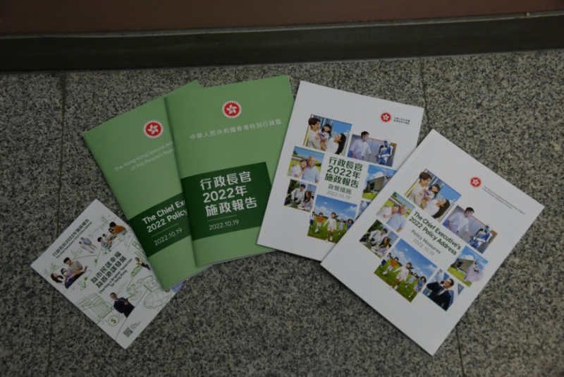 香港行政长官李家超今日(19日)早上11时在立法会公布任内首份《施政报告》,提出发展经济、改善民生的政策和措施,内容包括处理土地房屋问题和增强香港竞争力等。《施政报告》封面选用绿色,代表希望、生命力及和谐稳定;政府开会公布载述相关政策措施的篇章。