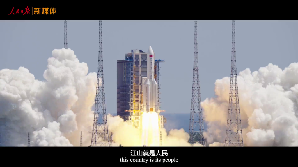 片中通过航母舰队、载人飞船、大凉山“天梯”、青藏铁路、三峡大坝等画面展现中国军事、航天科技、乡村扶贫、基建工程等成果。