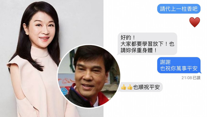 周玉蔻今早在Facebook贴出一张对话截图,写下“昨晚….”,只见对话中,她写下“请代上一柱香吧”,并留下一个红色爱心符号,接著对方回应“好的!大家都要学习放下!也请你保重身体!”周玉蔻则回“谢谢,也祝你万事平安”,对方也顺祝周玉蔻平安,双方对话停留在晚间9点08分。儘管未指名道姓,但看似对昔日情人(黄义交)最后的悼念。