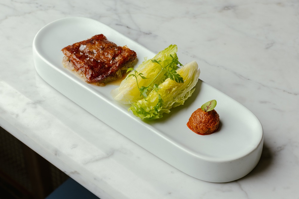 香煎猪脚冻配烤红椒坚果酱及迷你生菜沙律