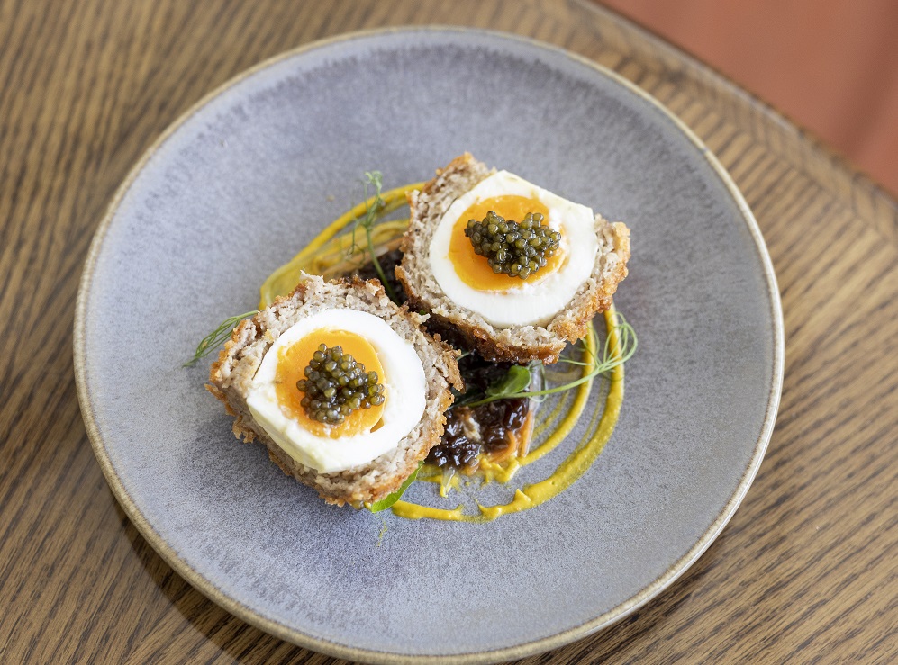 ▲White pudding Scotch Egg with Osciètre Caviar