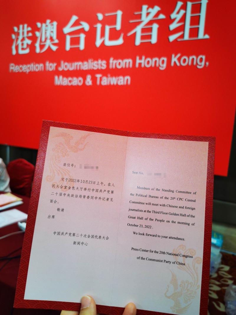首页>专题>新闻专题>海外媒体聚焦中共二十大 二十大|直击:新常委周日中午晤中外记者,红色请柬曝光 发布时间:2022-10-22 21:22 中国共产党第二十届中央委员会第一次全体会议新选出的中央政治局常委,将于周日(23日)中午12时许,与採访中共二十大的中外记者见面。 《星岛头条》记者获得请柬,颜色是喜庆的红色,请柬以二十大新闻中心名义发出,见面会地点将在人民大会堂金色大厅。据悉,文字记者一共200个座位,摄影摄像记者安排在后面。 据悉,届时中央广播电视总台和新华网将现场直播;全国各级广播电视主频率、主频道,各新闻网站、新媒体平台以及全国部分户外大屏、移动电视等同步转播。 ▲请柬封面是喜庆的红色。 ▲请柬以二十大新闻中心名义发出。 以上内容归星岛新闻集团所有,未经许可不得擅自转载引用。 专题 更多 > 中芯国际上半年营收预计超22亿美元,四季度将试产7nm工艺 太兴盈喜料多赚逾3倍,指将坚守审慎理财政策 中国移动半年多赚5%,中期息增近6% 清华女学霸创业、一年一融资,镁佳股份估值9.3亿美元冲刺港交所 应收账款走高,丰沃股份三成收入打“白条” 惠科股份IPO:获政府补助超53亿,向实控人堂弟采购超8亿 关税战|白宫:特朗普签行政命令,对华关税暂缓期再延长90日 高盛:64%关税成本由美企“买单”,消费者仅承担22% 美媒:特朗普政府通过关税施压,要求买美国军火 热门文章 特朗普1月20日上任美国总统,就职典礼8大重点率先看 蔡壁如选民众党主席有赢面?媒体揭3动机博声量最大化 看到柯建铭近日举动,沈富雄示警:没有处理是空前大危机 万千星辉颁奖典礼2024丨年度最高点击剧集片段头5位出炉 TVB视帝老婆变小学界万人迷!获全校小朋友等出场画面劲震撼 吴若希分享另类御夫术成功调教老公,曾受拖累被通缉气爆想离婚 美国网民涌“小红书”,华春莹笑答:很高兴 刘德华盼“四大天王”合体演出,市场预估纯门票收益达4亿! 传遭公安带走,万科祝九胜“报平安”,深圳当局据报已介入或被接管改组 韩国瑜尾牙“谢谢柯建铭”爆1句全场笑翻!叹“三宝”严重耗损