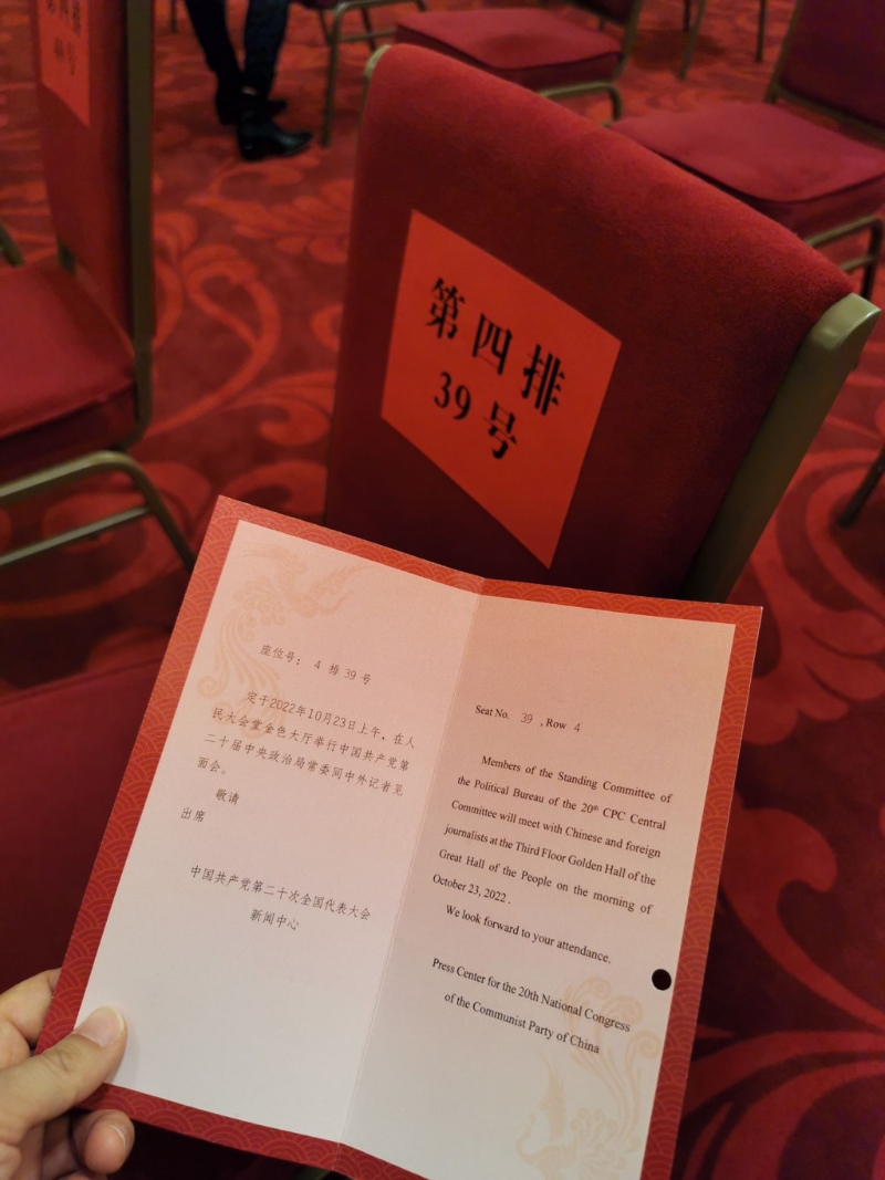 工作人员核对记者证并在请柬打卡,方可进入大会堂。请柬颜色是喜庆的红色,请柬以二十大新闻中心名义发出,见面会地点将在人民大会堂金色大厅。据悉,文字记者一共200个座位,摄影摄像记者安排在后面。